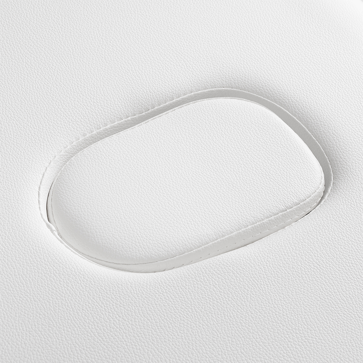 To ensure maximum comfort, the person using the table can rest their head on the ergonomic headrest, which is included in the set. This element is easy to adjust – it allows the angle to be adjusted in two planes, which makes it possible to precisely adjust its position to the user’s needs and the nature of the treatment being performed. For supine therapy, the headrest can be removed, using a special hole in the tabletop instead. When not in use, the hole can be covered with the included plug, restoring the surface to an aesthetic and uniform appearance.