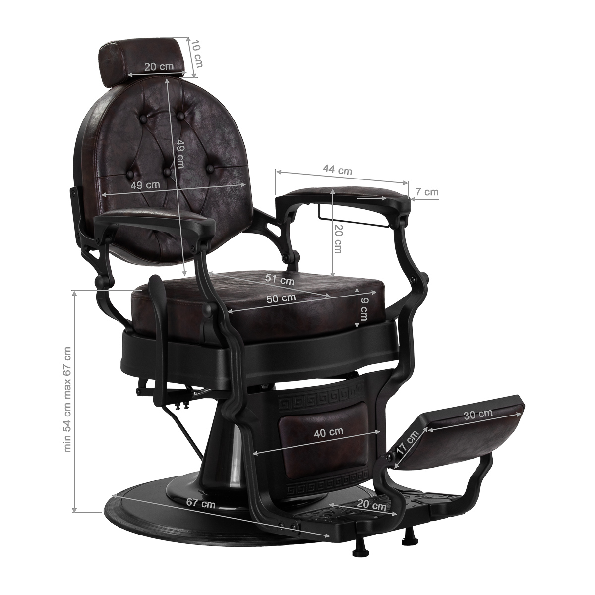 The solid construction of the base ensures stability and high comfort of use. The seat filling is made of durable, deformation-resistant foam and the upholstery is made of pleasant-to-touch synthetic leather with a semi-matte finish, ensuring the durability of the furniture and its comfortable use for a long time. They also make the equipment resistant to moisture, durable and easy to clean. The covering in shades of brown with quilting and decorative buttons gives it a unique character. The chair with a characteristic design, referring to the vintage style, perfectly fits the atmosphere of barbershops, emphasizing their unique atmosphere.