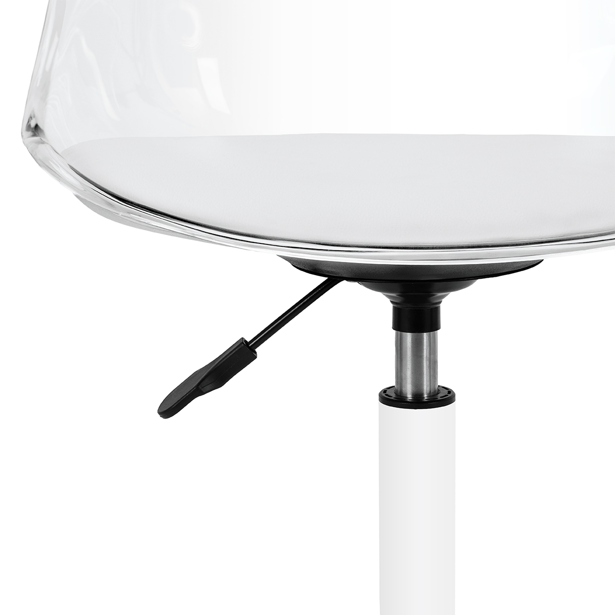 The model catches the eye with its striking, transparent backrest, giving the whole a light and modern character. The combination of the transparent structure with the seat cushion upholstered in white synthetic leather and the white base creates a sophisticated contrast that emphasises elegance. This makes the chair not only a functional piece of furniture, but also a stylish decoration for the office. It blends in perfectly with any interior, fitting in perfectly with the aesthetics of contemporary beauty salons.