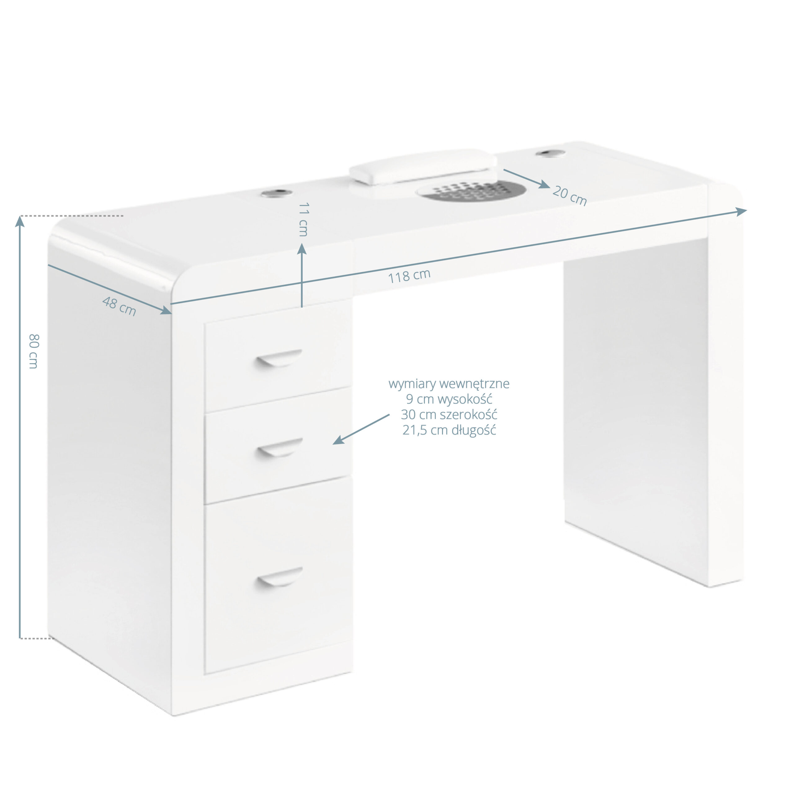 Three spacious drawers make it easier to organize and keep the most necessary cosmetics and tools in order. The desk is equipped with a practical absorber that effectively reduces the amount of harmful dust, providing clean and fresh air in the workplace. At the same time, thanks to its integration into the tabletop, it does not take up valuable work space. Specially designed places for cables make it easier to organize necessary devices in the salon, such as nail drill machines, treatment lamps or nail lamps, allowing you to hide the cables.