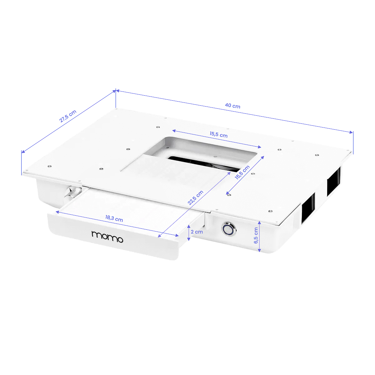 The Momo J-02 c assettedust absorber built into the countertop significantly improves comfort and hygiene, effectively removing dust generated during cosmetic treatments such as manicures. With this device, the air in the salon remains clean and the work area remains free of contamination, increasing safety for both the beautician and clients. The dust absorber is easy to use and maintain, further enhancing its functionality. Regular cleaning and filter replacement ensure consistently high absorption efficiency. Additional replacement filters can be purchased (SKU 123581).