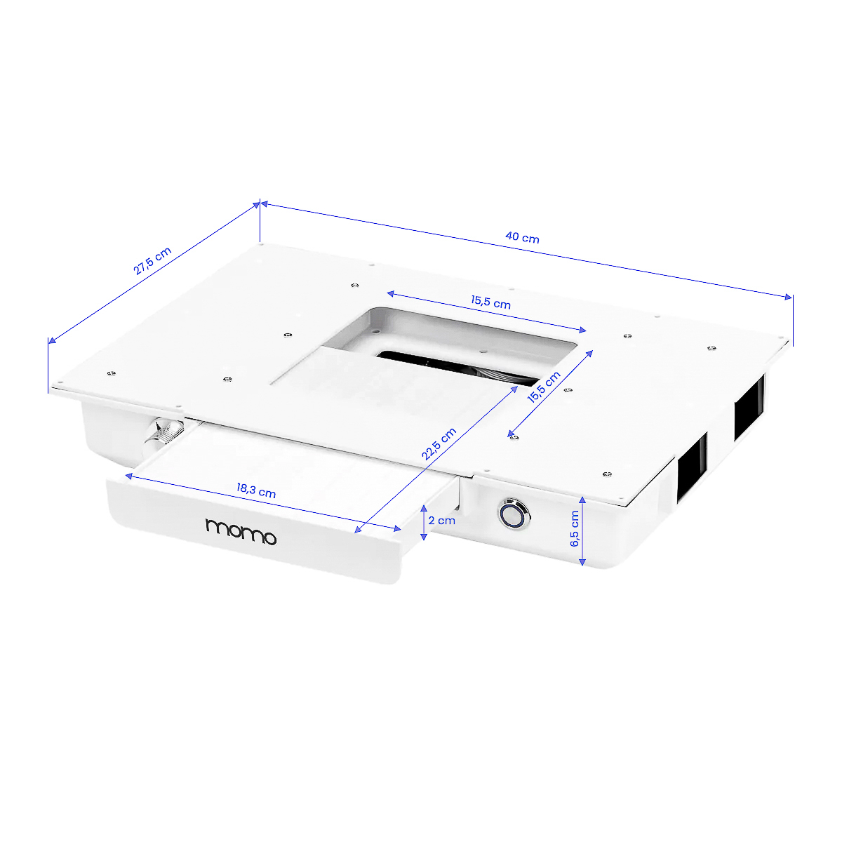 The Momo J-02 c assette dustabsorber built into the countertop significantly improves comfort and hygiene, effectively removing dust generated during cosmetic treatments such as manicures. With this device, the air in the salon remains clean and the work area remains free of contamination, increasing safety for both the beautician and clients. The dust absorber is easy to use and maintain, further enhancing its functionality. Regular cleaning and filter replacement ensure consistently high absorption efficiency. Additional replacement filters can be purchased (SKU 123581).