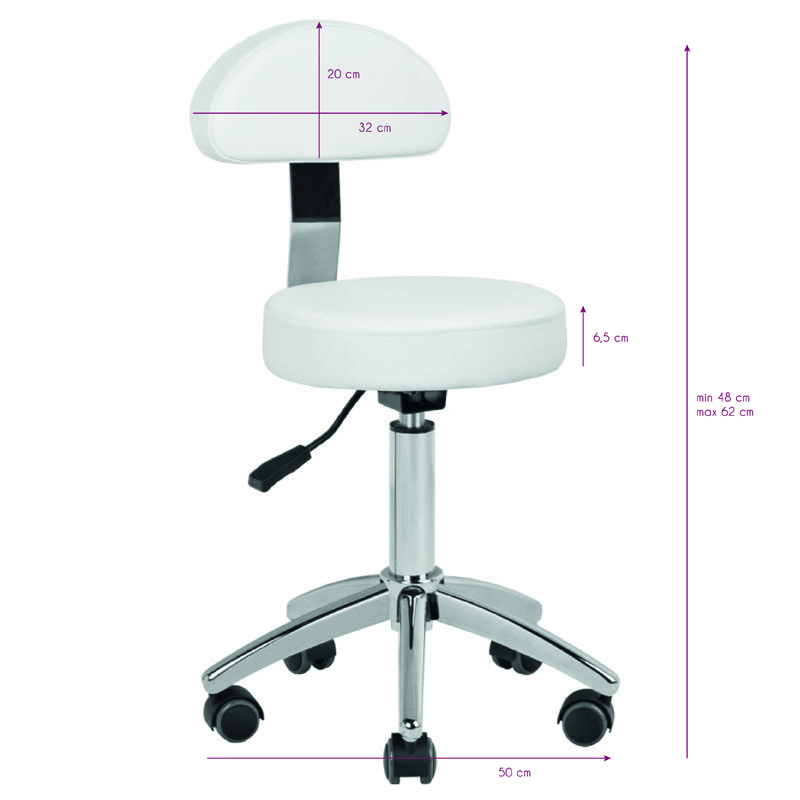 comfortable cosmetic stool, stable on a five-star base, with plastic wheels, with the possibility of disassembling the backrest, white, a necessary piece of furniture in a beauty salon.