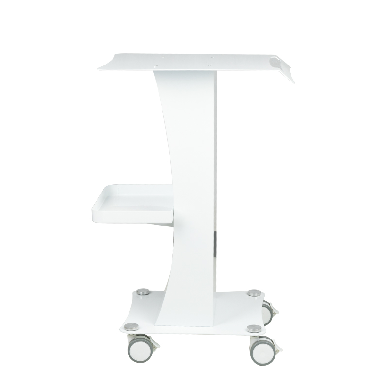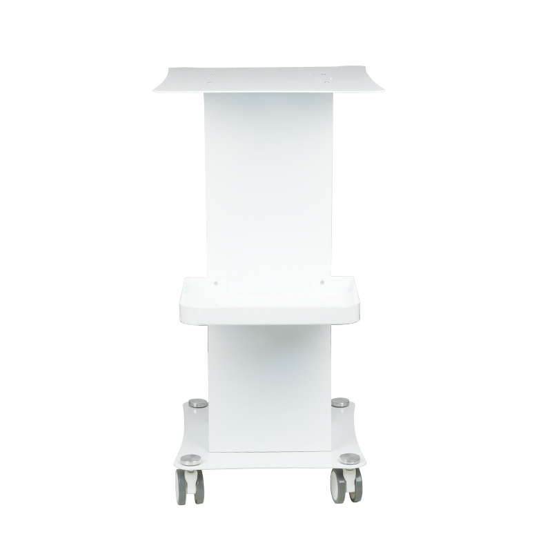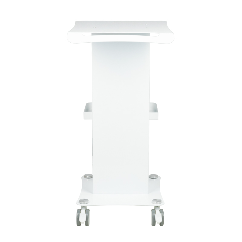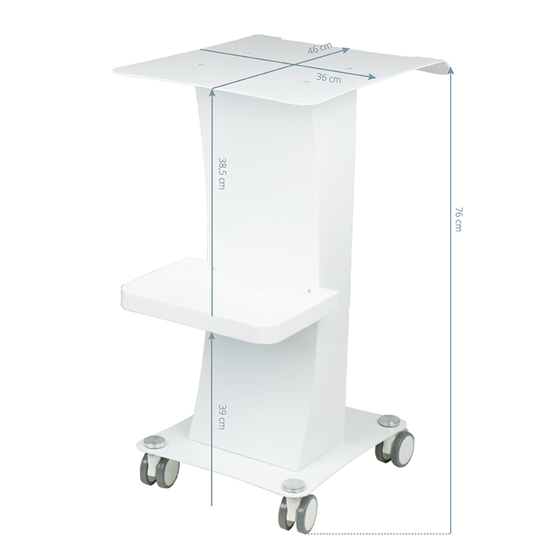 functional, metal table with rubber wheels with a locking function. Perfect as a table for a cosmetic device. it has a stable shelf for the device and another shelf for accessories, and thanks to the wheel, the table is mobile and easy to move. the piece of furniture provides convenience and comfort during work.