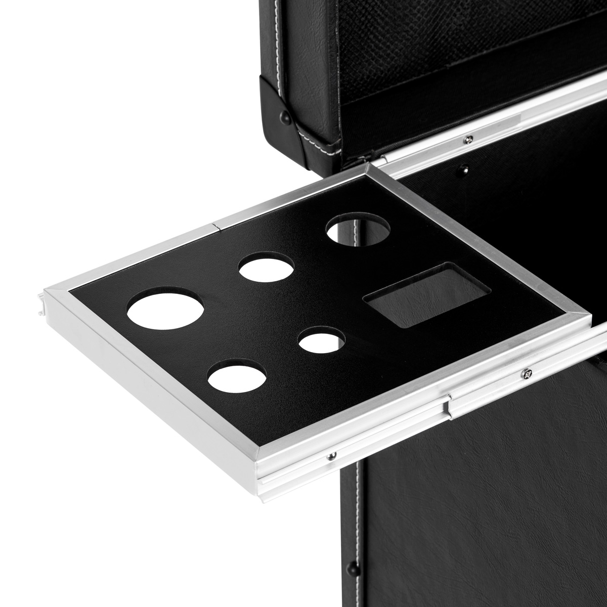 The capacious organizer is equipped with a large number of compartments. Pull-out shelves with handles and places for accessories, drawers, compartments and special pockets for storing barbering products and tools make it easier to keep your work area tidy and significantly improve the organization of the space. Easy assembly and removal of the wheels improve the mobility of the furniture, thanks to which the helper can be moved freely. The extendable handle, located at the back of the helper, allows the furniture to be easily transported.