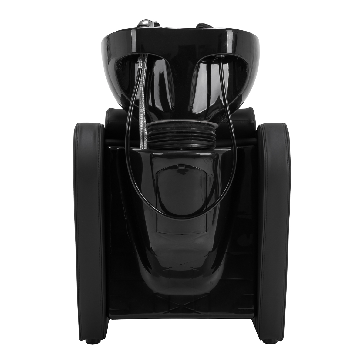 The depth of the ceramic washbasin bowl in shades of black allows for comfortable and efficient performance of a wide range of hairdressing services, preventing excessive splashing of water and products used during the treatment. The material used makes the washbasin durable, resistant to discoloration and scratches, and very easy to keep clean. The appropriately profiled collar and inclined backrest provide support and comfort while washing hair, and thanks to the comfortable plastic overlay in shades of black, the client will not feel discomfort from the cold ceramic surface.