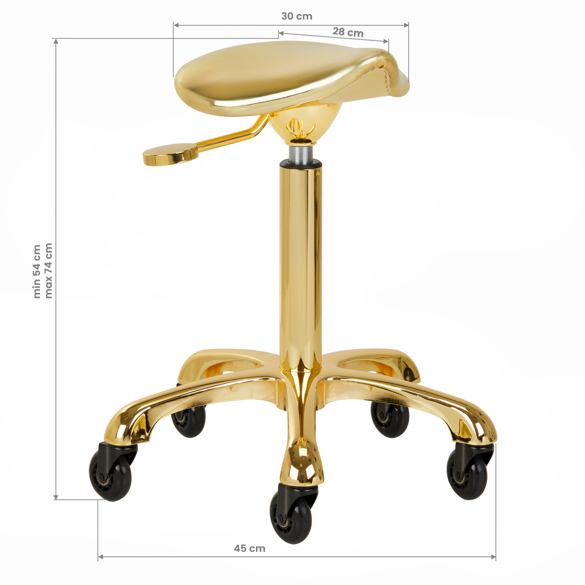 The unique look of the stool is memorable, looks extremely elegant and will be a stylish element of any interior. It will be perfect for both hairdressing and beauty salons. A chrome-plated frame and a stable five-star base with rubber wheels ensure safe use, considerable mobility and the ability to adapt to your needs. Properly profiled in the shape of a saddle, the seat filled with non-deformable foam guarantees comfort to users. The covering made of semi-matte synthetic leather in shades of gold is easy to clean, durable and resistant to moisture.