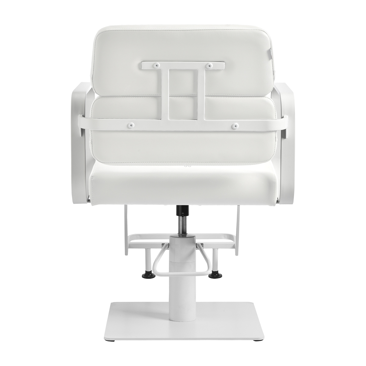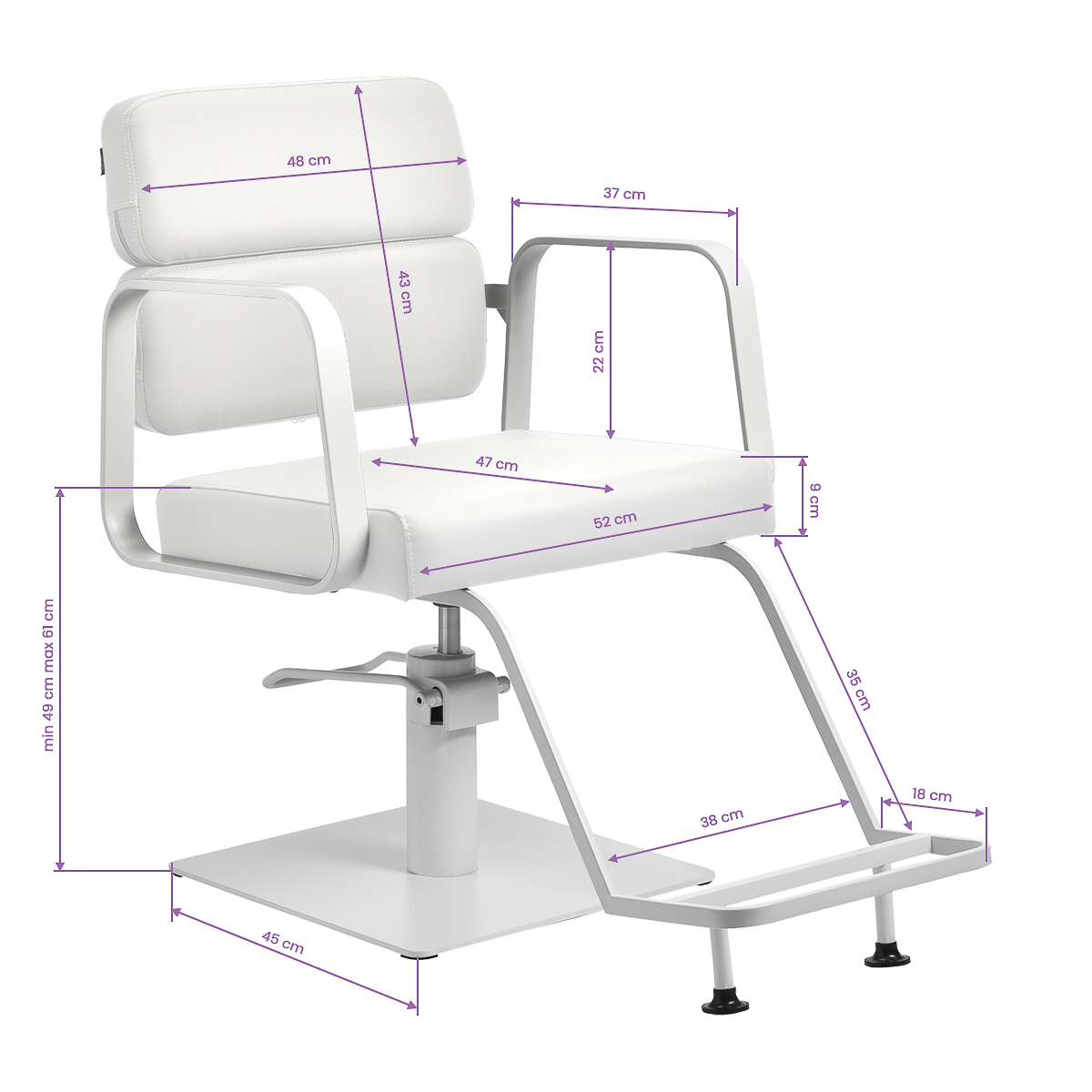 The full rotation mechanism of the chair makes the hairdresser’s work more effective and comfortable. A solid, flat, square-shaped base guarantees stability during use. The matte-finished, smooth surface gives the element an elegant look and makes it easy to keep clean. A comfortable seat with foam filling ensures high comfort of use, even during many hours of treatments. Geometric, metal armrests allow for the correct positioning of the client’s shoulders – this means that he does not bury his head in his shoulders or slouch – which makes it much easier to perform precise treatments, including haircuts. A stylish footrest dedicated to this model provides stable support for the user’s feet.