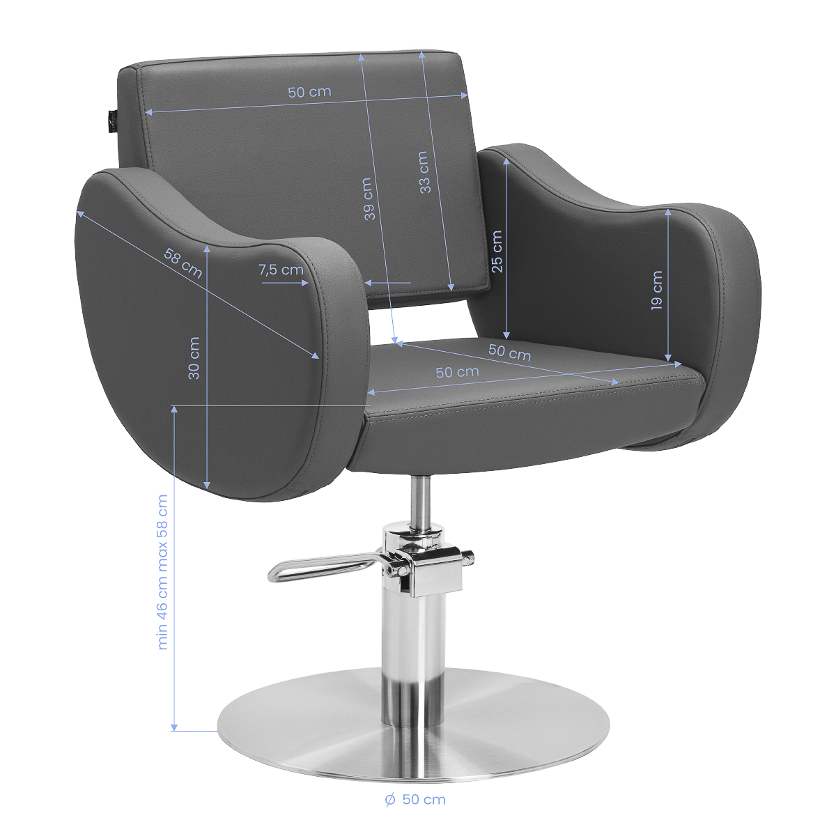 The Gabbiano Sewilla hairdressing chair combines minimalist design with the comfort of everyday use. The stable, round base in chrome gives it an elegant look, while foam padding and soft-touch synthetic leather in shades of grey with a matte finish ensure high comfort. The materials used are durable, moisture-resistant, and easy to clean. It will work perfectly in both modern and classic interiors, emphasizing the professional style of the interior.