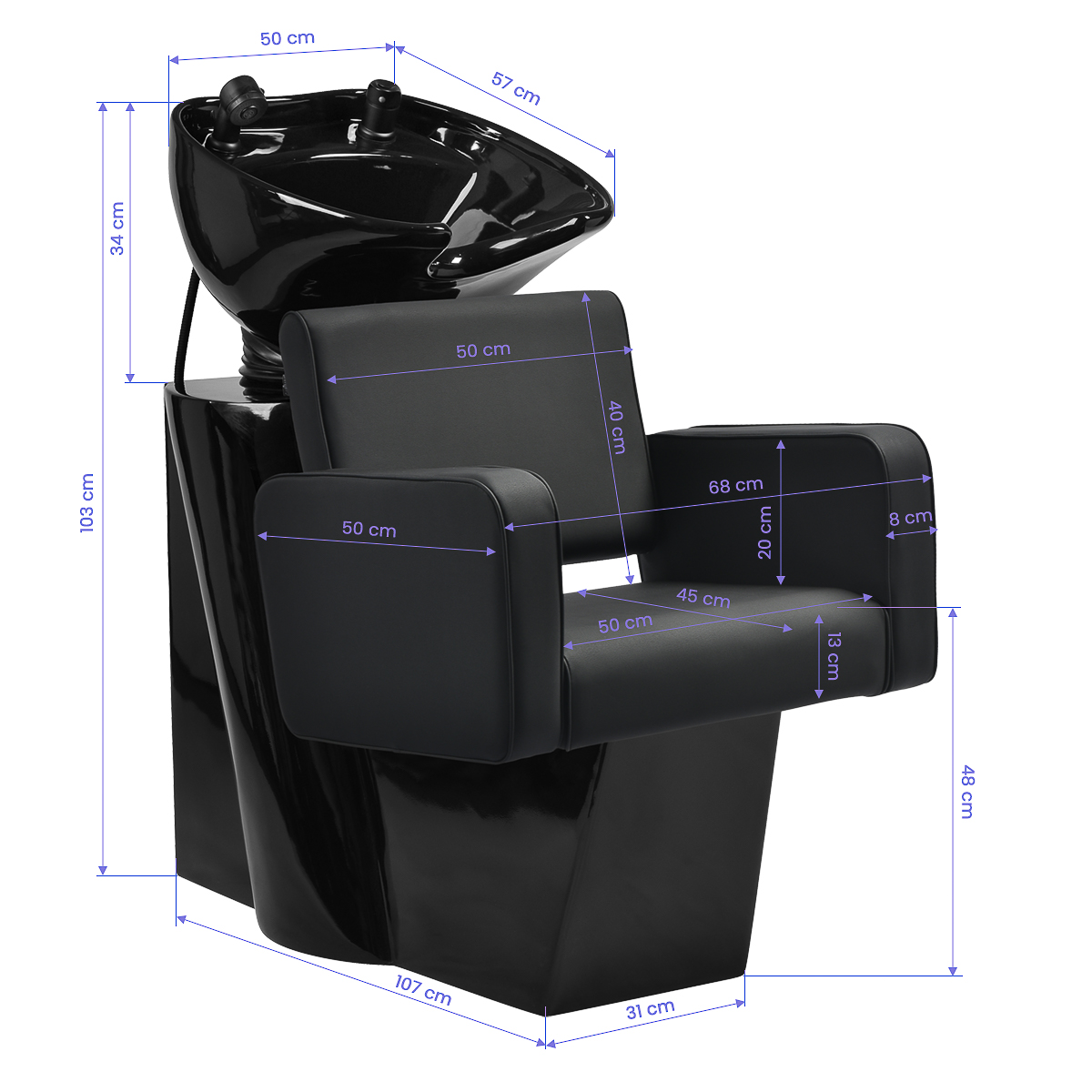 The chair’s geometric form with softly rounded edges combines simplicity and comfort in a modern design. The square seat and gently angled armrests create a harmonious whole, ensuring a comfortable position during treatments. The backrest, with its optimal tilt angle, supports proper posture, allowing for complete relaxation. The high-quality black synthetic leather upholstery is resistant and easy to clean. The geometric, modern shape of the furniture emphasises the elegant character of the wash unit and blends in seamlessly with the interior design of the salon. The set includes a complete set of fittings with a matte black finish, including a faucet, shower head, and matching hoses, ensuring a complete set of tools for the job.