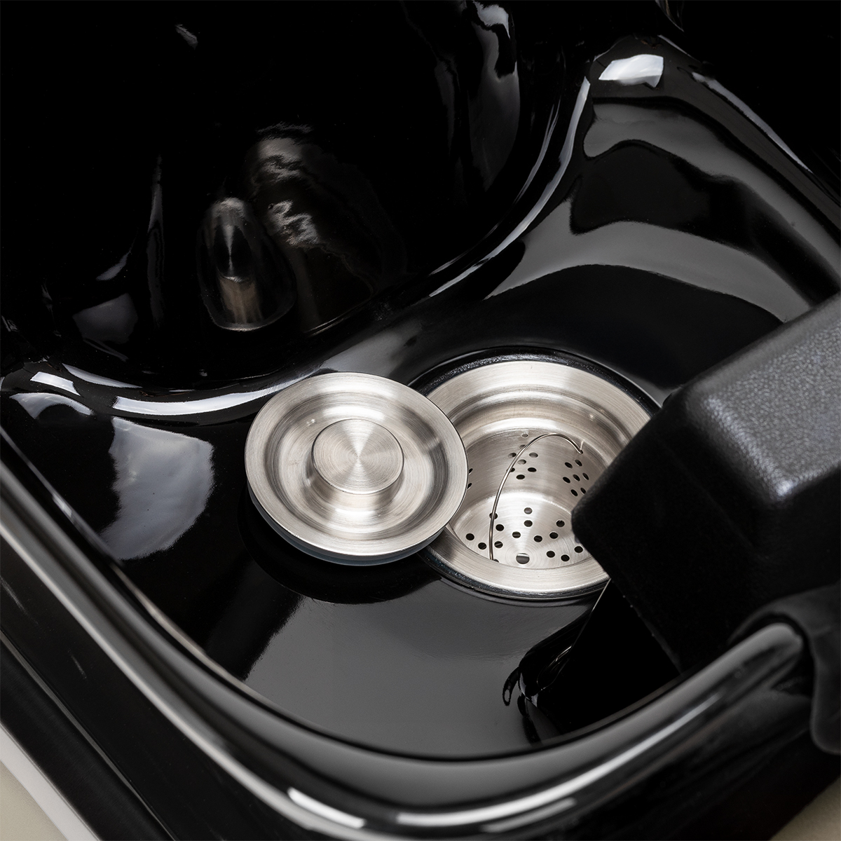 The ceramic bowl in shades of black, with its modern shape and appropriate depth, effectively prevents splashing of water and products used during treatments, allowing for comfortable and effective performance of a wide range of services. The properly profiled collar and angled backrest provide comfort and support during hair washing, while the black plastic cover protects the client from the cold ceramic surface, ensuring a pleasant experience during the treatment.