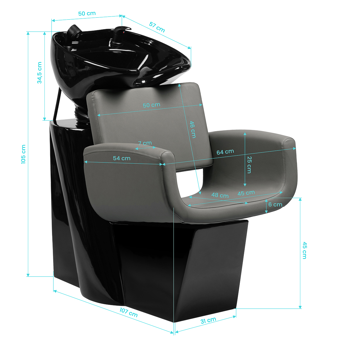 This minimalist chair with a distinctively rounded seat combines simple form with high comfort. The backrest, with its optimal tilt angle, supports a natural body position. The upholstery, made of high-quality synthetic leather in shades of grey, is resistant and easy to clean. The modern design of the furniture emphasises the elegant character of the wash unit and perfectly complements the salon’s décor. The set includes a complete set of fittings with a matte finish in shades of black, including a faucet, shower head, and matching hoses, providing a complete set of tools for work.