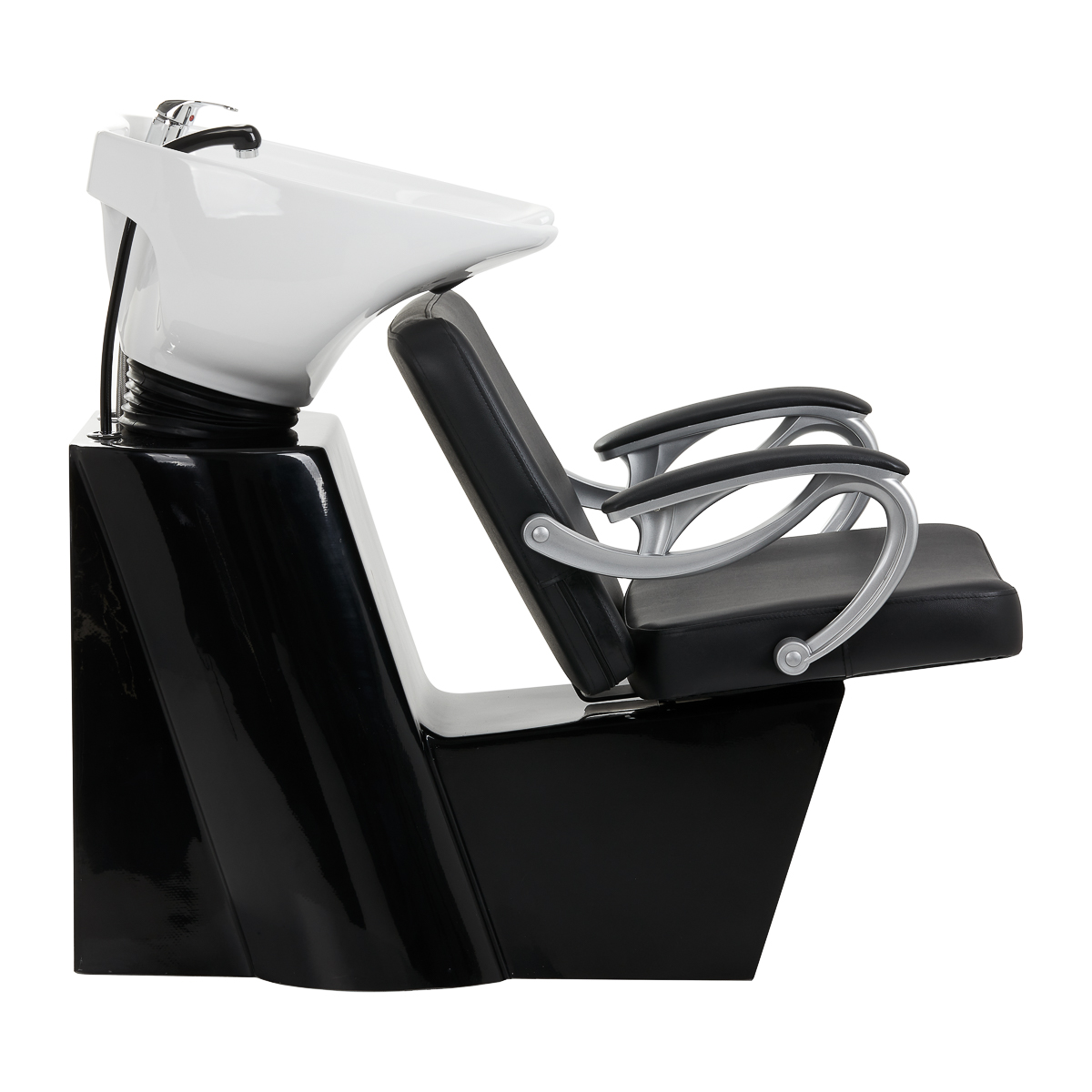 A properly profiled chair filled with durable foam ensures high comfort of use and interestingly curved, partially upholstered armrests allow for the correct positioning of the client’s shoulders and are a visually attractive element. Comfortable backrest allows you to take the right position and ensures back support. The black covering and decorative gold-lacquered metal surfaces give it a timeless elegance and additionally guarantee long-term durability and ease of cleaning. The original appearance of the hairdressing wash unit gives the interior a unique expression. The set includes complete fittings, including a faucet, a shower head and dedicated hoses to provide a complete set of tools for work.