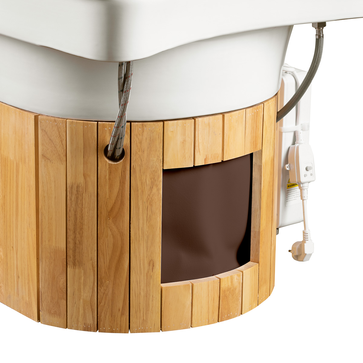 The elegant Gabbiano Head Spa Bali bed with integrated wash is an innovative solution for luxurious beauty and relaxation treatments. It is perfect for Japanese Head SPAs, hydrotherapy, water massage, aromatherapy, and steam therapy, providing a holistic experience. It also works well for body massages, offering versatile therapeutic and relaxing options. Advanced technology and ergonomic design not only provide unparalleled comfort for customers but also facilitate the work of beauty and wellness professionals. The combination of a natural wooden structure with soft brown upholstery gives the whole thing an elegant look and guarantees comfort of use