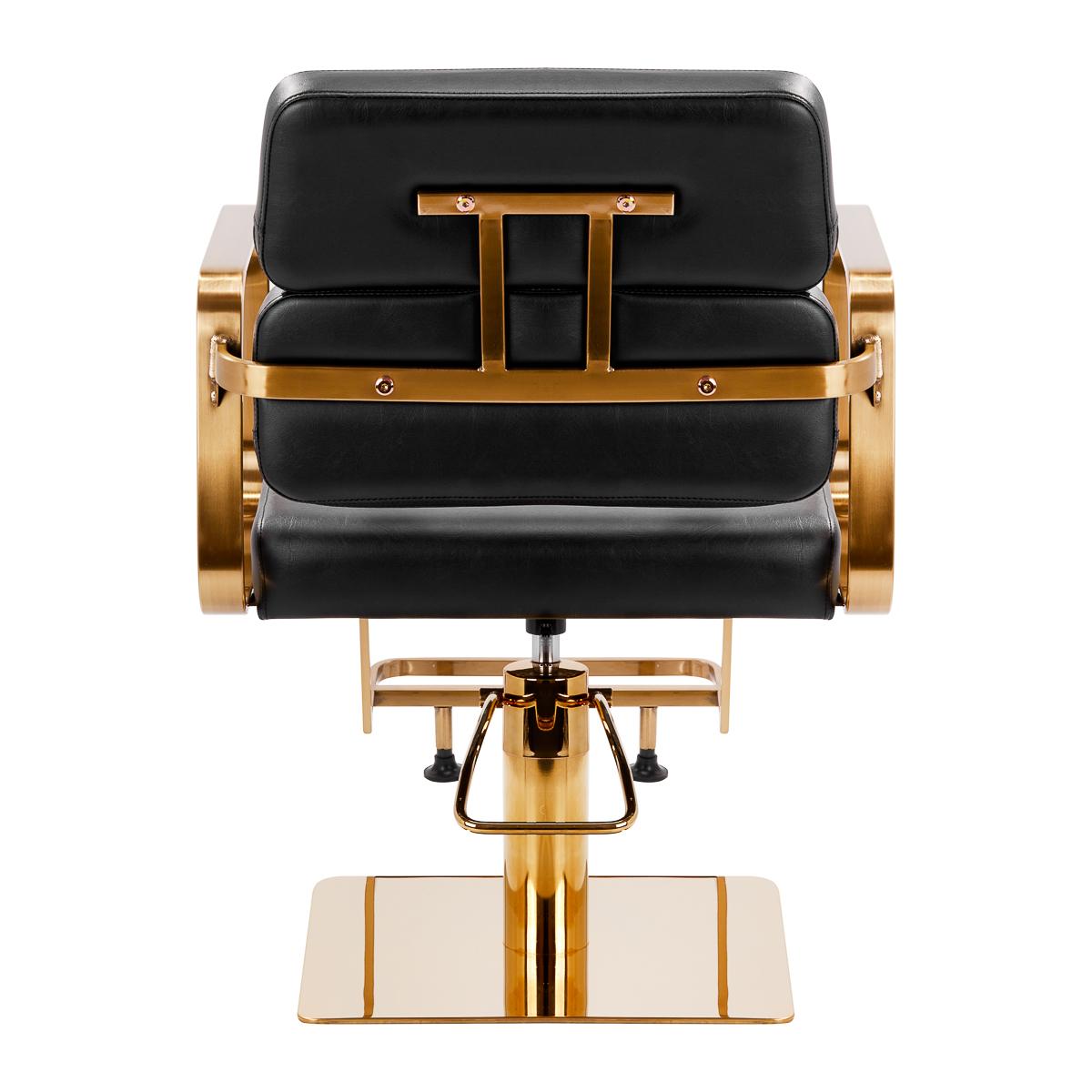 The full rotation mechanism of the chair makes the hairdresser’s work more effective and comfortable. A solid, flat, square-shaped base guarantees stability during use. The matte-finished, smooth surface gives the element an elegant look and makes it easy to keep clean. A comfortable seat with foam filling ensures high comfort of use, even during many hours of treatments. Geometric, metal armrests in shades of gold allow for the correct positioning of the client’s shoulders – this means that he does not bury his head in his shoulders or slouch – which makes it much easier to perform precise treatments, including haircuts. A stylish footrest dedicated to this model provides stable support for the user’s feet.
