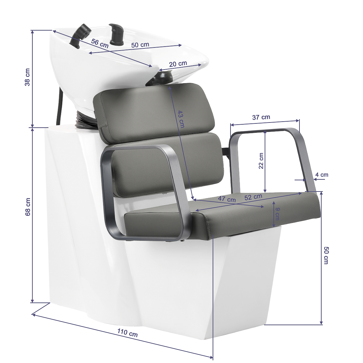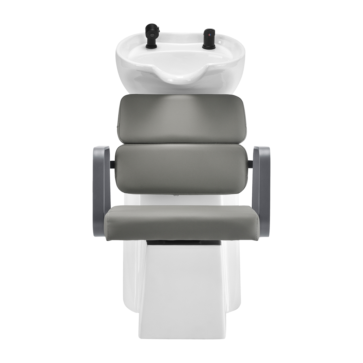 The profiled chair provides adequate lumbar support and, therefore, high comfort of use. Metal armrests in shades of gry with a geometric shape allow for the correct positioning of the customer’s shoulders. Filling with durable, deformation-resistant foam and upholstery made of pleasant-to-touch synthetic leather in shades of gray ensure the durability of the furniture, ease of cleaning and comfortable use for a long time. The original, elegant appearance of the hair wash unit gives the interior a unique expression. The set includes complete fittings in shades of black, including a faucet, a shower head and dedicated hoses to provide a complete set of tools for work.