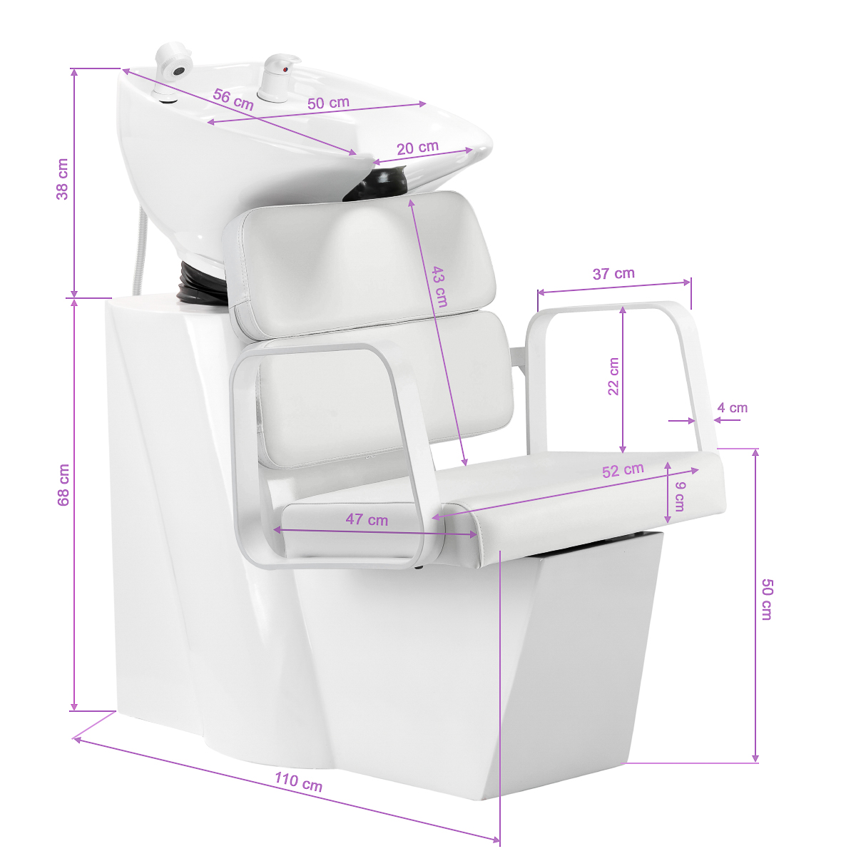The profiled chair provides adequate lumbar support and, therefore, high comfort of use. Metal armrests in shades of white with a geometric shape allow for the correct positioning of the customer’s shoulders. Filling with durable, deformation-resistant foam and upholstery made of pleasant-to-touch synthetic leather in shades of white ensure the durability of the furniture, ease of cleaning and comfortable use for a long time. The original, elegant appearance of the hair wash unit gives the interior a unique expression. The set includes complete fittings in shades of white, including a faucet, a shower head and dedicated hoses to provide a complete set of tools for work.