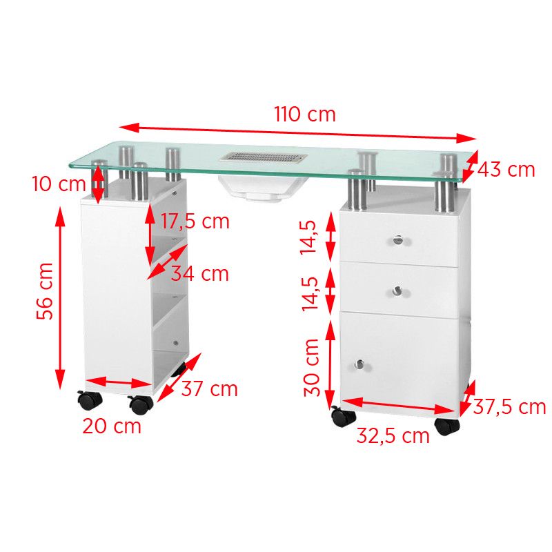 it is a piece of furniture not only functional, but also extremely elegant, perfectly matching the furnishings of modern rooms. in addition to three open shelves, it has a cabinet and two spacious drawers, and a dust absorber. thanks to as many as eight castors, the furniture is stable and easy to move around in rooms, even when it is loaded. A several-centimeter increase under the table top made of thick, tempered glass makes the proposed table perfect for manicure treatments.