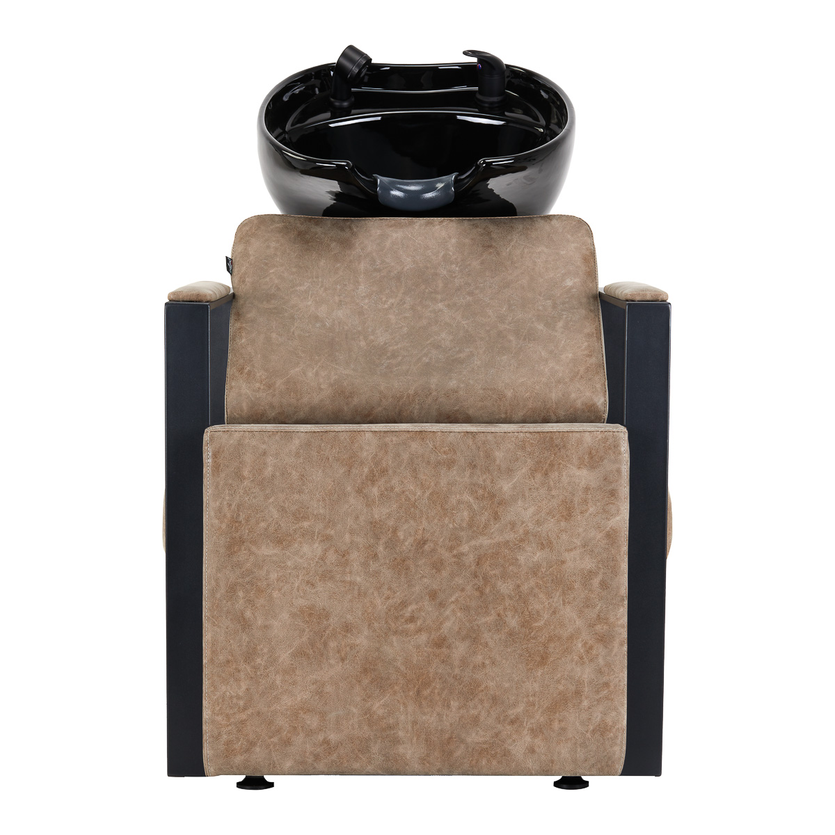 A properly profiled chair filled with durable foam ensures high comfort of use and geometric, partially upholstered armrests allow for correct positioning of the client’s shoulders. The backrest is placed at an optimal angle and provides excellent support for the spine. Cover made of synthetic leather in shades of brown guarantees long-term durability and ease of cleaning. The original, elegant look of wash adds the interior’s unique expression. Stabilization legs add stability and subtly emphasize the stylish character of the hairdressing wash unit. The set includes complete fittings with a matte finish in shades of black, including a faucet, shower head and dedicated hoses to provide a complete set of tools for work.
