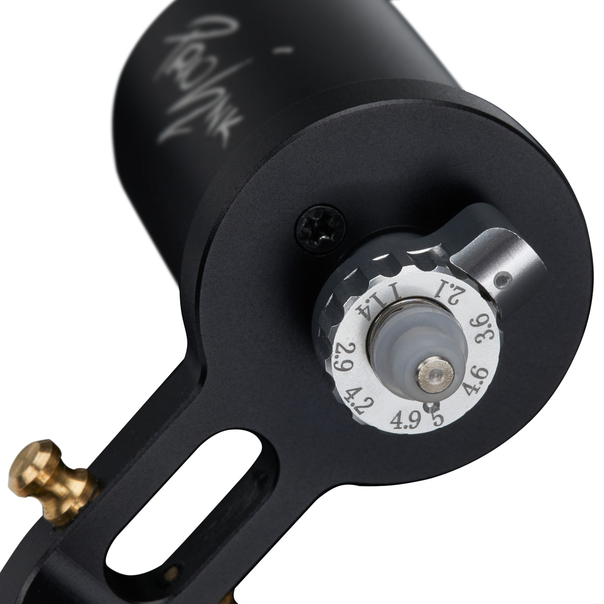 Rotary tattoo machine, PRO-INK Connection Type: RCA Working voltage: 5-12V Power: 4.5W Stroke adjustable 1mm-5mm Made of high-grade aircraft aluminum. A multi-purpose machine, ideally suited to traditional needles and cartridges. Thanks to the wide tension range and adjustable stroke, it is ideal for contours and fillings.
