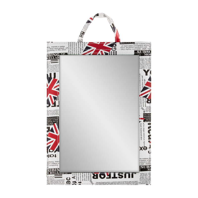 Hairdressing mirror in a housing with UK flag motifs and a handle. Perfect for working in a hair salon to show the client the hairstyle on the back of the head.